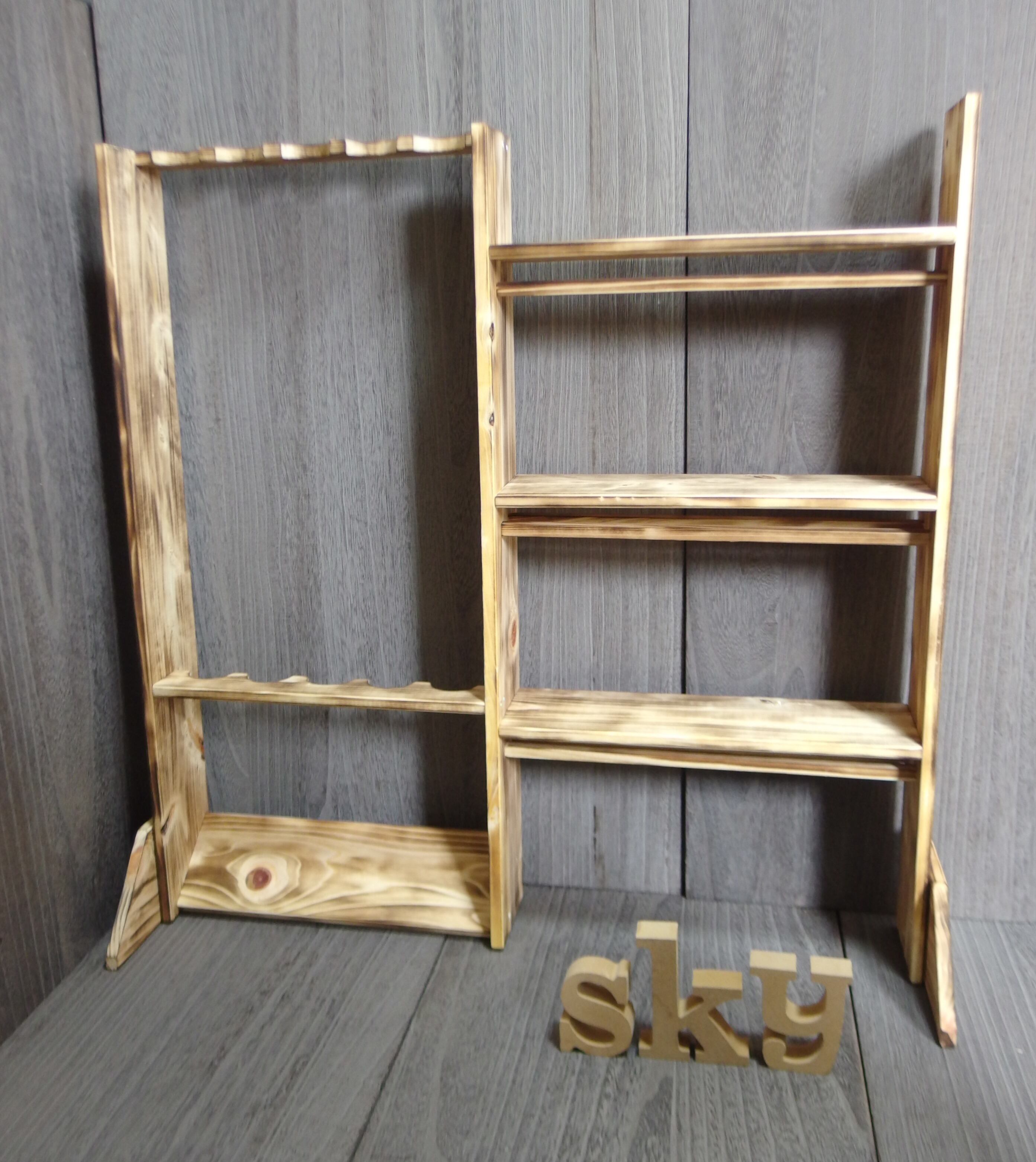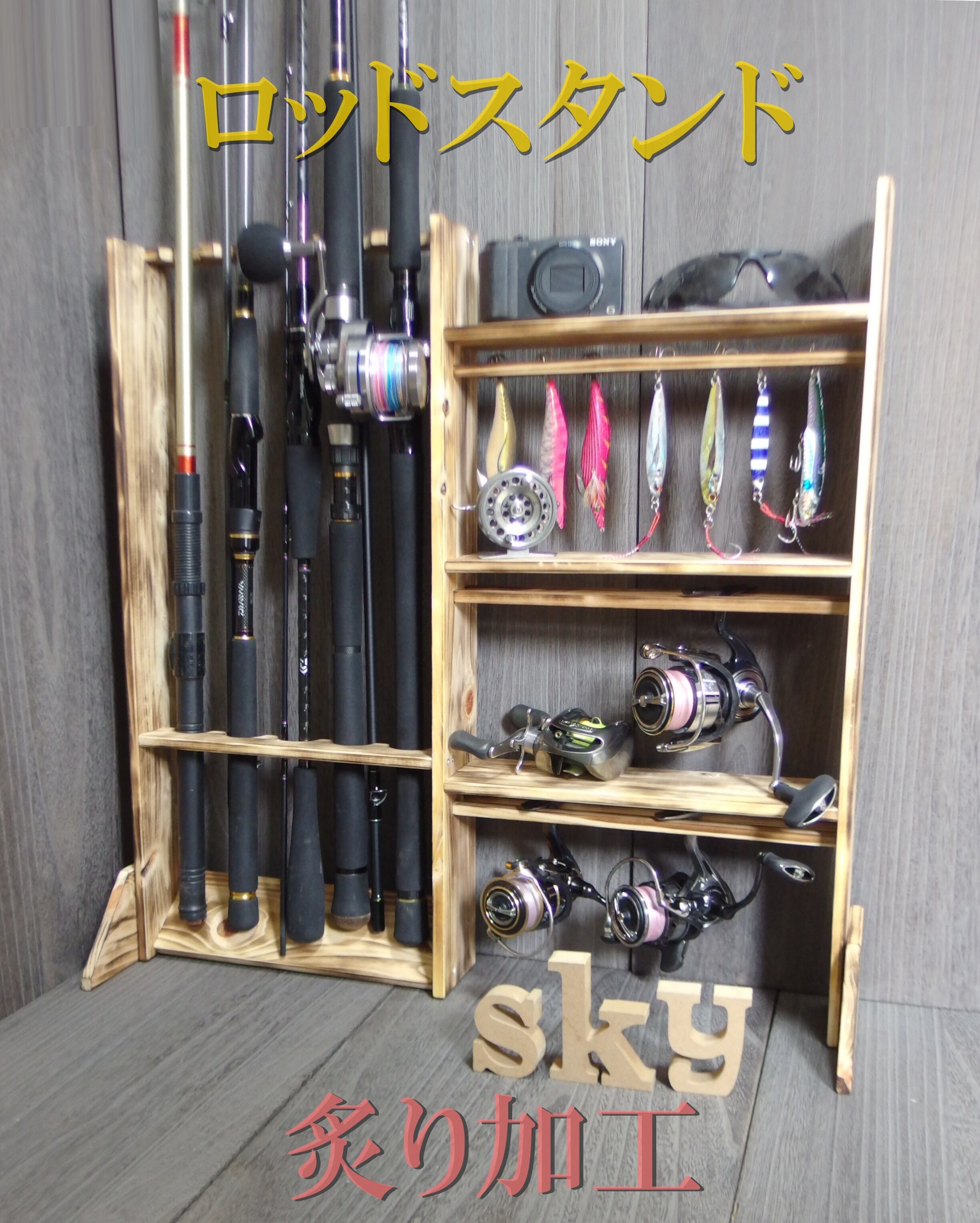 ロッドスタンド 5本 リールスタンド 炙り加工 小物置き 国産ヒノキ製