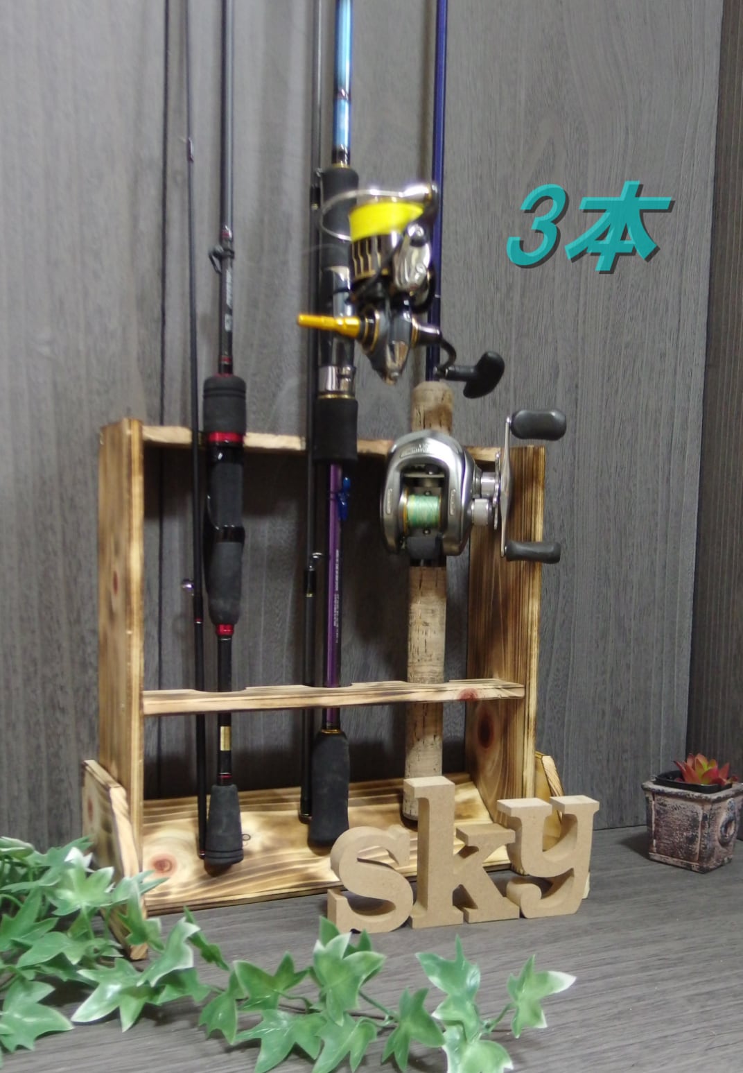ロッドスタンド 3本 炙り加工 国産ヒノキ製